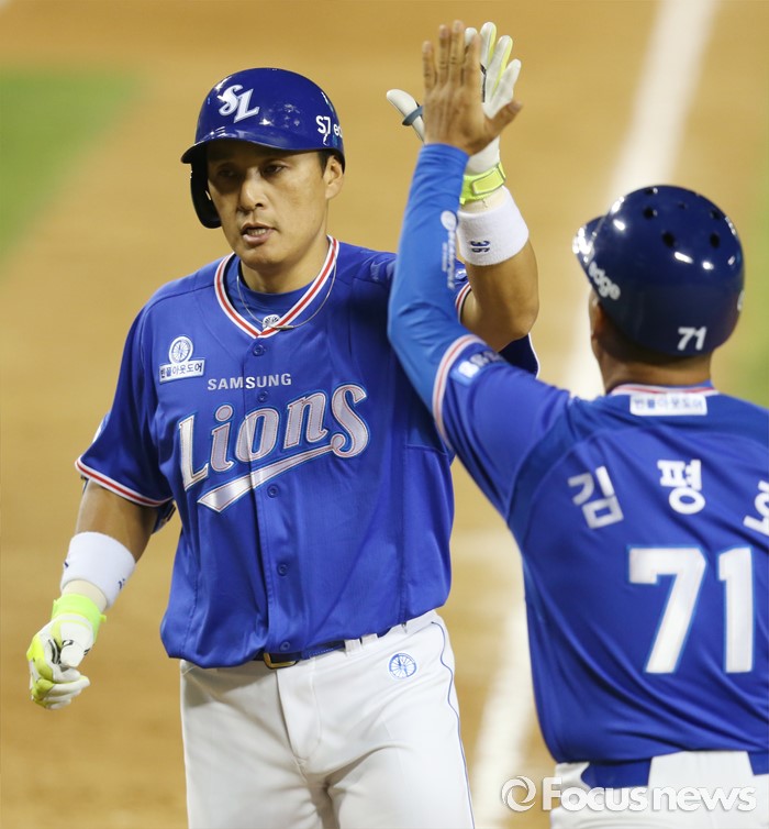 (서울=포커스뉴스) 7일 서울 잠실구장에서 열린 2016 프로야구 삼성-LG 경기 8회초 2사 1,2루에서 삼성 이승엽이 우월 3점 홈런을 치고 홈인하면서 김평호 코치의 환영을 받고 있다.