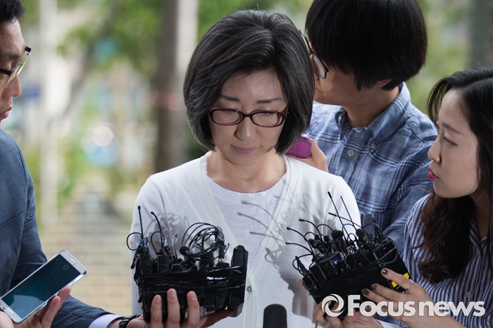 (서울=포커스뉴스) 미공개 정보를 이용해 주가하락 손실을 피한 혐의를 받고 있는 최은영 전 한진해운 회장이 피의자 신분으로 8일 오전 서울 양천구 서울남부지검에 들어서며 취재진 질문을 받고 있다.