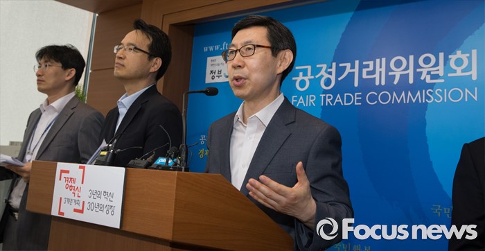 (세종=포커스뉴스) 신영선 공정거래위원회 사무처장이 8일 오전 세종시 정부세종청사 공정위 기자실에서 대기업집단 지정제도 개선방안에 대한 브리핑을 하고 있다. 오른쪽부터 신영선 사무총장, 박춘호 기획재정부 법인세제과장. 이병원 기획재정부 기업환경과장.