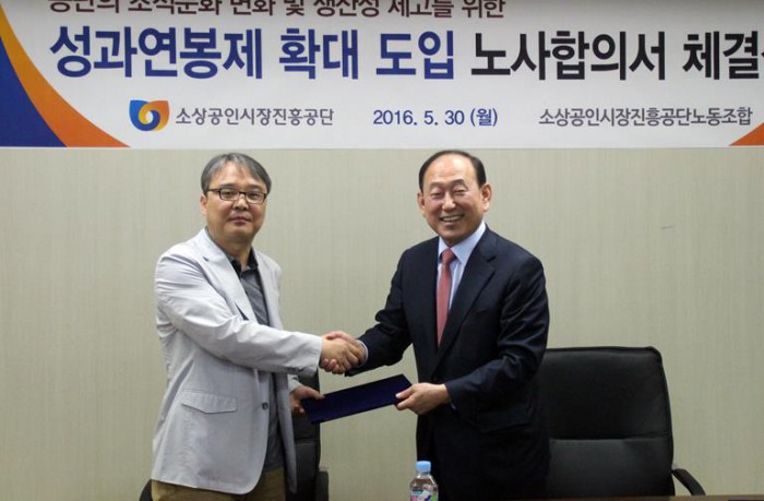 한편, 공단은 추후 공정한 성과평가지표 개발에 역점을 두고, 내부 갈등의 씨앗이 되고 있는 일반직과 상담직의 보수격차를 해소해 이들 양 직군의 통합을 추진할 계획이다.소상공인시장진흥공단은 노사합의를 통해 성과연봉제 확대 도입을 확정했다.<사진제공=소상공인시장진흥공단>