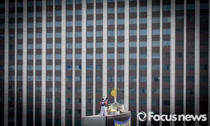 (서울=포커스뉴스) 8일 오후 서울 을지로 옛 국가인권위원회 옥상 광고탑에서 기아자동차 비정규직 노동자의 정규직화를 요구하며 363일 동안 고공농성을 벌인 한규협씨와 최정명씨가 지상으로 내려갈 준비를 하고 있다.