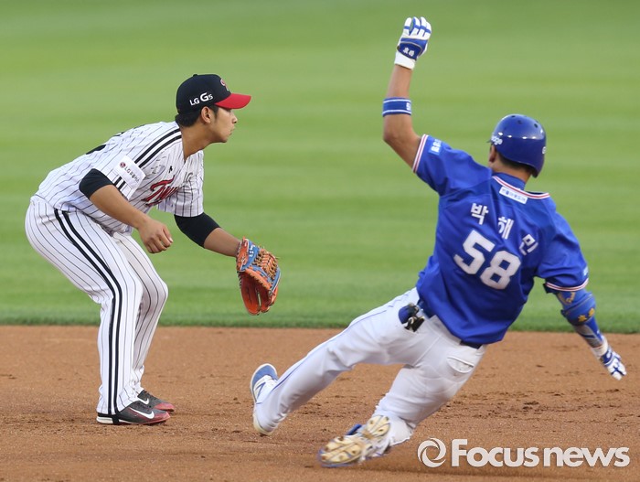 (서울=포커스뉴스) 9일 서울 잠실구장에서 열린 2016 프로야구 삼성-LG 경기 3회초 2사후 삼성 박해민이 우익수 앞에 떨어지는 안타를 치고 2루에서 세이프되고 있다.