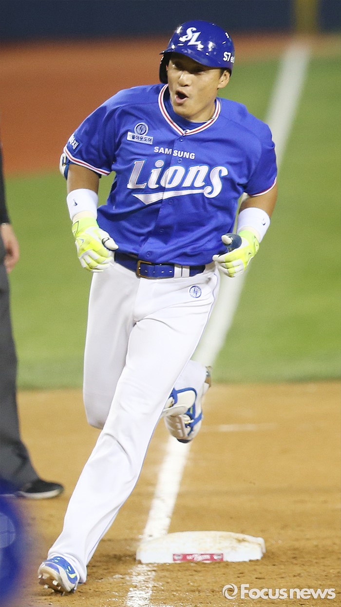 (서울=포커스뉴스) 7일 서울 잠실구장에서 열린 2016 프로야구 삼성-LG 경기 8회초 2사 1,2루에서 삼성 이승엽이 우월 3점 홈런을 치고 밝은 표정으로 3루를 돌고 있다.