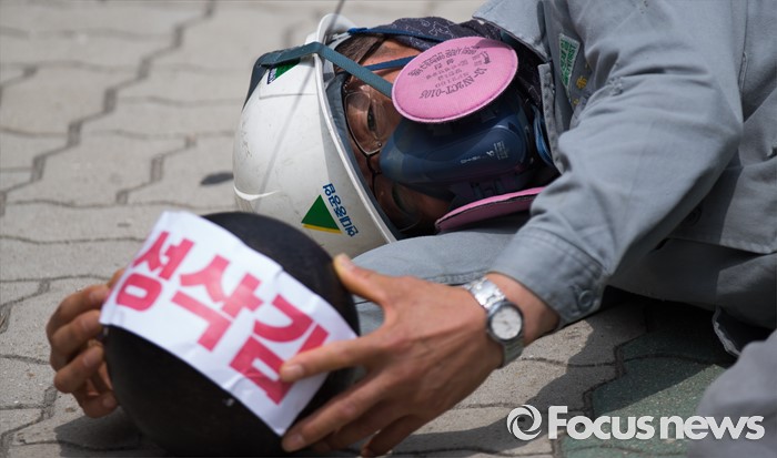 (서울=포커스뉴스) 8일 오전 서울 여의도 국회 앞에서 민주노총 금속노조 조합원들와 조선소 하청업체 직원들이 구조조정 중단과 고용안전 대책을 요구하는 퍼포먼스를 하고 있다.