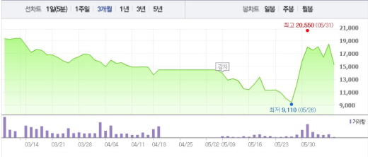 앞서 현대상선은 내년 말까지 만기가 돌아오는 8043억원의 회사채 채무재조정에 성공했다. 구조조정의 중심인 용선료 인하 협상도 이번 주 최종 타결될 것으로 예상되고 있다.주가흐름<사진출처=네이버 캡쳐>