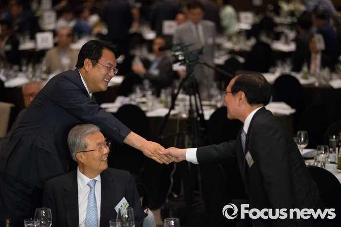 (서울=포커스뉴스) 9일 오후 서울 여의도구 63빌딩 그랜드볼룸에서 열린 '6.15 남북정상회담 16주년 기념식'에 참석한 정진석 새누리당 원내대표(왼쪽)와 노회찬 정의당 원내대표가 악수하고 있다.