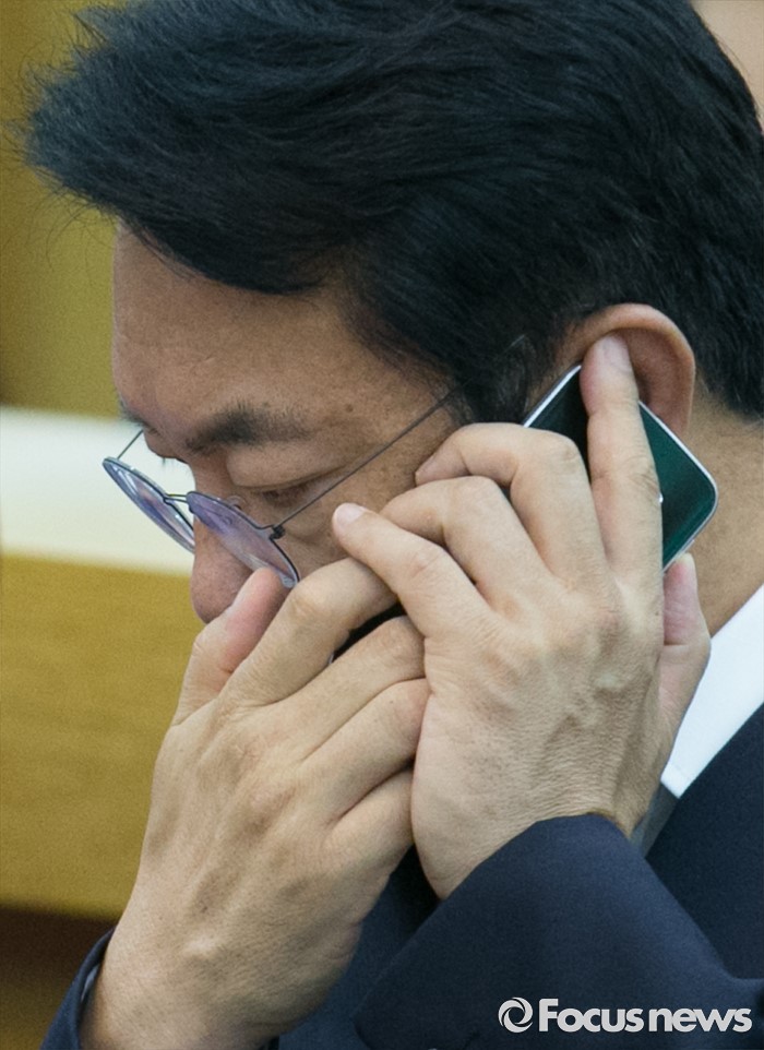 (서울=포커스뉴스) 8일 오전 서울 여의도 국회 의원회관에서 열린 국가미래전략포럼(일명 알파포럼) 창립총회 및 강연회에 참석한 정진석 새누리당 원내대표가 누군가와 통화를 하고 있다. 이날 정 원내대표와 서 전 최고위원은 국회의장직을 야당에 양보한다는 뜻을 밝혔다.