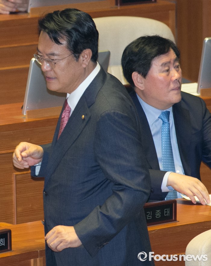(서울=포커스뉴스) 9일 오후 서울 여의도 국회에서 열린 20대 국회 첫 본회의에 참석한 정진석(왼쪽) 새누리당 원내대표와 최경환 의원이 대화한 뒤 자리로 향하고 있다.