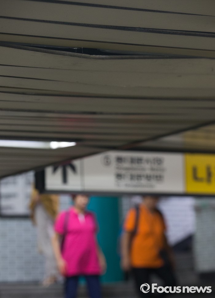 (서울=포커스뉴스) 9일 오전 서울 지하철 종로5가역 지하상가와 출입구를 연결하는 통로의 천장이 훼손되어 있다. 플라스틱 소재로 마감된 천장은 움푹 패어있었으며 휘어지거나 깨진 곳도 많아 위태로워 보인다.