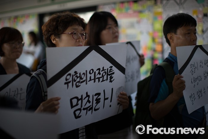 (서울=포커스뉴스) 지난달 28일 서울 지하철 2호선 구의역에서 스크린도어 정비 도중 숨진 김 모씨의 발인을 하루 앞둔 8일 오후 서울 광진구 지하철 2호선 구의역에서 시민들이 김 모씨를 추모하며 행진하고 있다.