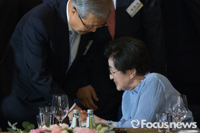 (서울=포커스뉴스) 9일 오후 서울 여의도구 63빌딩 그랜드볼룸에서 열린 '6.15 남북정상회담 16주년 기념식'에 참석한 김종인 더불어민주당 비상대책위원회 대표(왼쪽)와 이희호 여사가 악수하고 있다.