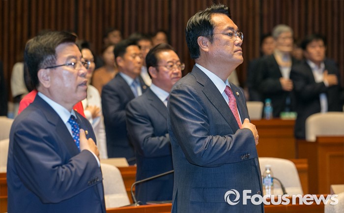 (서울=포커스뉴스) 9일 오전 서울 여의도 국회에서 국회 부의장 후보 선출을 위해 열린 새누리당 의원총회에 참석한 정진석(오른쪽) 원내대표, 김광림 정책위의장 등 의원들이 국기에 대한 경례를 하고 있다.