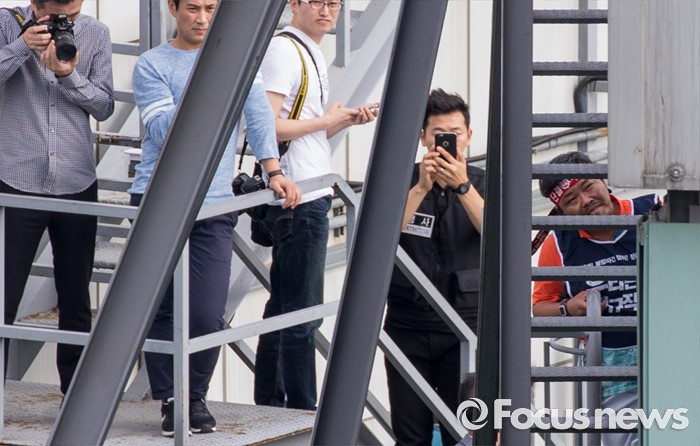 (서울=포커스뉴스) 8일 오후 서울 을지로 옛 국가인권위원회 옥상 광고탑에서 기아자동차 비정규직 노동자의 정규직화를 요구하며 363일 동안 고공농성을 벌인 한규협씨가 지상으로 내려오고 있다.
