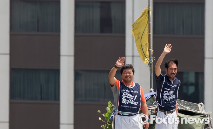 (서울=포커스뉴스) 8일 오후 서울 을지로 옛 국가인권위원회 옥상 광고탑에서 기아자동차 비정규직 노동자의 정규직화를 요구하며 363일 동안 고공농성을 벌인 한규협(왼쪽)씨와 최정명씨가 취재진을 향해 인사하고 있다.