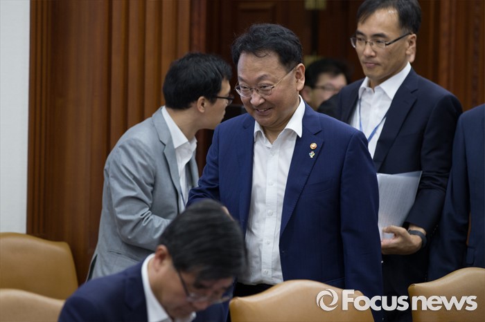 (서울=포커스뉴스) 9일 서울 종로구 정부서울청사에서 열린 제 8차 경제관계장관회의에서 유일호 부총리 겸 기획재정부 장관이 들어서고 있다.