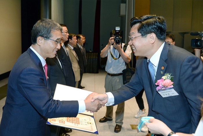 (서울=포커스뉴스) 주형환 산업통상자원부 장관이 9일 서울 포스코센터 서관 아트홀에서 열린 제17회 철의 날 기념식에 참석해 유공자에게 훈·포장을 수여하고 있다.
