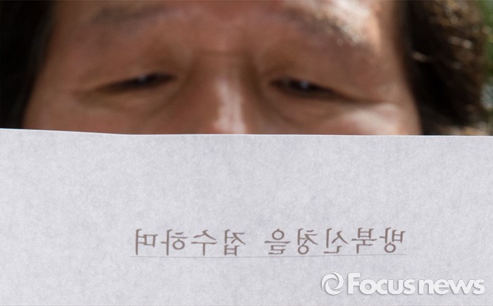 (서울=포커스뉴스) 8일 오전 서울 종로구 정부서울청사 앞에서 정기섭 개성공단기업 비상대책위원회 위원장이 통일부에 방북 신청서 제출 전 기자회견문을 낭독하고 있다.