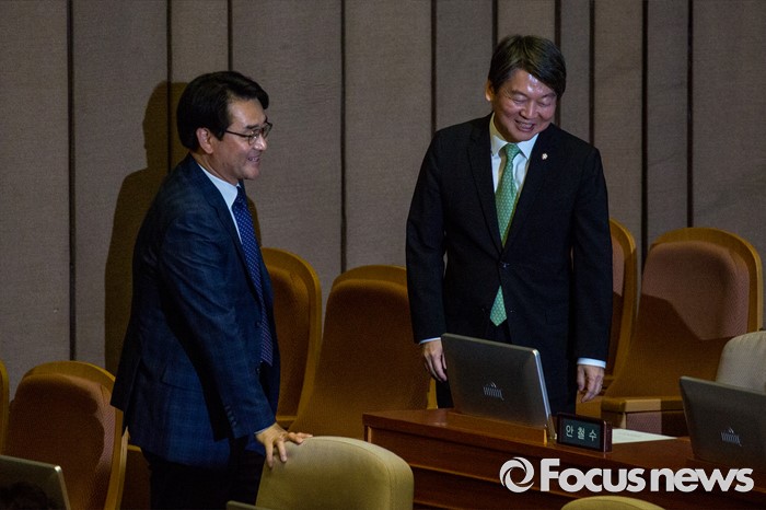 (서울=포커스뉴스) 안철수 국민의당 상임공동대표와 박용진 더불어민주당 의원이 9일 오후 서울 여의도 국회에서 열린 본회의에 참석해 대화를 나누고 있다.
