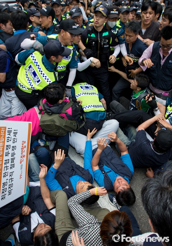 (서울=포커스뉴스) 8일 오후 서울 을지로 옛 국가인권위원회 옥상 광고탑에서 기아자동차 비정규직 노동자의 정규직화를 요구하며 363일 동안 고공농성을 벌인 한규협씨와 최정명씨가 경찰에 의해 구급차로 끌려가자 노조원들이 차량을 막아서고 있다.