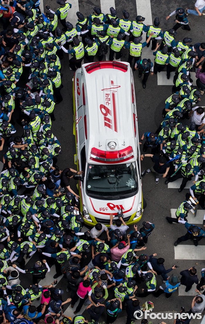 (서울=포커스뉴스) 8일 오후 서울 을지로 옛 국가인권위원회 옥상 광고탑에서 기아자동차 비정규직 노동자의 정규직화를 요구하며 363일 동안 고공농성을 벌인 한규협씨와 최정명씨가 경찰에 의해 구급차로 끌려가자 노조원들이 차량을 막아서고 있다.