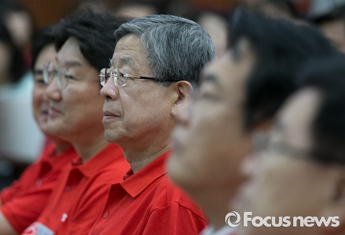 (과천=포커스뉴스) 10일 오전 경기도 과천 국가공무원인재개발원에서 열린 2016 새누리당 정책워크숍에 참석한 김광림(오른쪽부터) 정책위의장, 정진석 원내대표, 김희옥 혁신비대위원장, 권성동 사무총장 등이 이기권 고용노동부 장관의 강연을 듣고 있다.