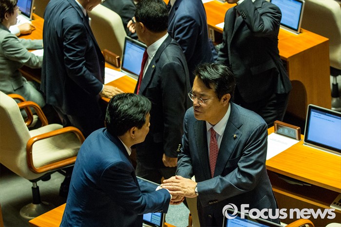 (서울=포커스뉴스) 정진석 새누리당 원내대표와 김관영 국민의당 원내수석부대표가 9일 오후 서울 여의도 국회에서 열린 본회의에 참석해 인사 하고 있다.