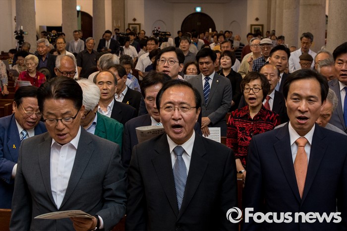 (서울=포커스뉴스) 10일 오전 서울 중구 정동 대한성공회 서울주교좌성당에서 열린 6월항쟁 29주년 기념식에 참석한박지원(앞줄 왼쪽부터) 국민의당 원내대표, 노회찬 정의당 원내대표, 우상호 더불어민주당 원내대표가 '광야에서'를 제창하고 있다.
