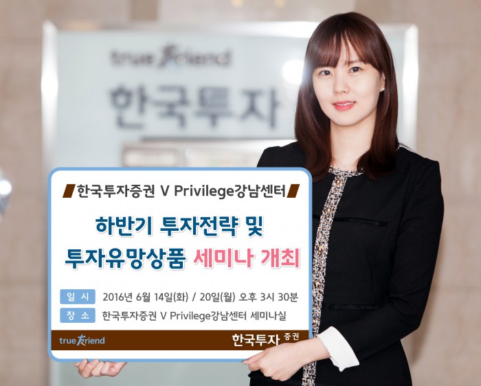 (서울=포커스뉴스) 한국투자증권이 오는 14일, 20일 양일간 오후 3시30분부터 한국투자증권 V Privilege강남센터 세미나실에서 '하반기 투자전략 및 투자유망상품' 세미나를 진행한다고 10일 밝혔다.