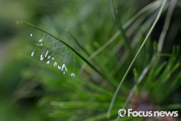 (서울=포커스뉴스) 9일 오전 서울 용산구 행정공제회 주차장 소나무 잎에 우담바라가 피어있다. 불교계에서 우담바라를 신성시 하는 것과 달리 학계에선 실잠자리의 알이나 곰팡이의 일종으로 보고있다.