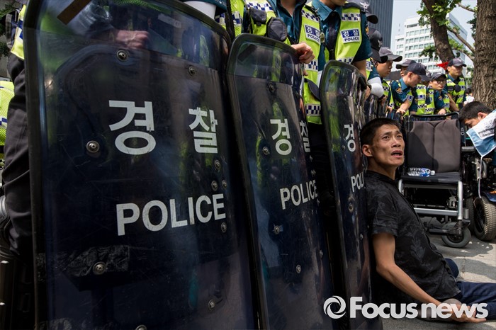 (서울=포커스뉴스) 9일 오전 서울시청 서소문별관 인근의 버스정류장에서 장애인차별철폐연대 회원들이 장애인 이동권 보장을 촉구하며 경기도행 광역버스 기습 점거시위를 벌여 경찰과 충돌하고 있다.