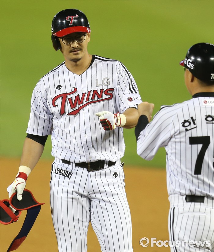 (서울=포커스뉴스) 7일 서울 잠실구장에서 열린 2016 프로야구 삼성-LG 경기 8회말 1사 1,2루에서 대타로 나온 LG 박용택이 좌중간 안타를 쳐2루주자를 불러 들이고 1루에서 한혁수 코치와 주먹을 마주치고 있다.