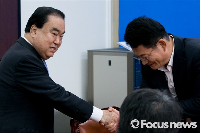 (서울=포커스뉴스) 8일 오후 서울 여의도 국회 더불어민주당 원내대표실에서 새누리당의 국회의장직을 야당이 맡고 운영 및 법사위를 여당이 맡자는 제안과 관련 논의를 위해 진행된 우상호 원내대표와 4선 이상 중진 의원과의 간담회에 참석한 문희상(왼쪽), 송영길 의원이 인사하고 있다.