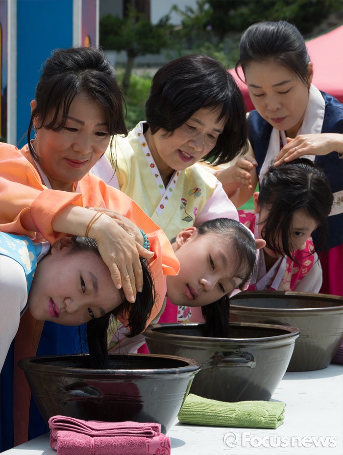 (대전=포커스뉴스) 9일 오후 (음력5월5일) 단오를 맞아 대전 동구 쌍청당공원에서 열린 판암골 단오한마당에서 한복입은 여학생들이 창포 삶은물에 머리를 감고 있다.