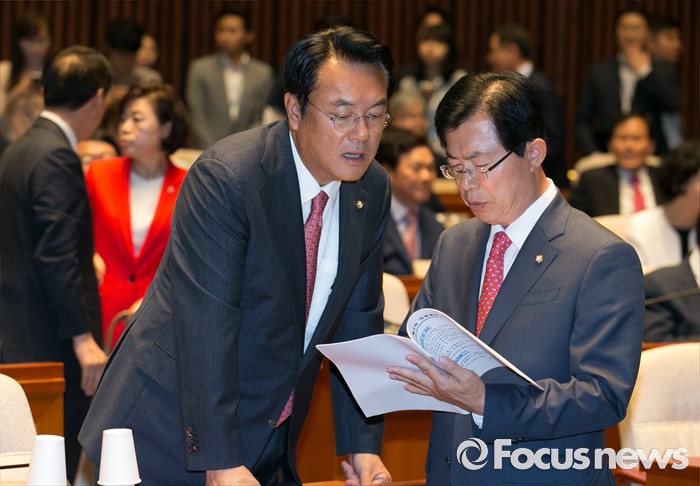 (서울=포커스뉴스) 9일 오전 서울 여의도 국회에서 국회 부의장 후보 선출을 위해 열린 새누리당 의원총회에 참석한 정진석(왼쪽) 원내대표와 이만희 원내부대표가 대화하고 있다.