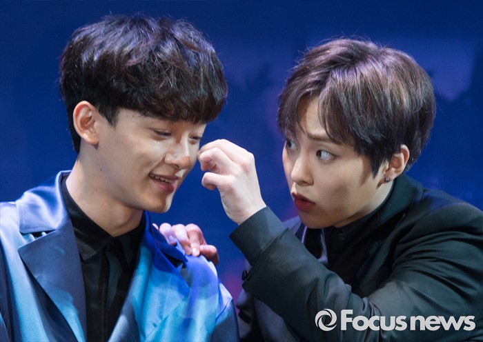(서울=포커스뉴스) 8일 오전 서울 강남구 코엑스 아티움에서 열린 아이돌 그룹 엑소의 3집 앨범 'EX'ACT' 발표 쇼케이스에 참석한 멤버 시우민(오늘쪽)이 첸의 얼굴에 붙은 먼지를 제거하고 있다.