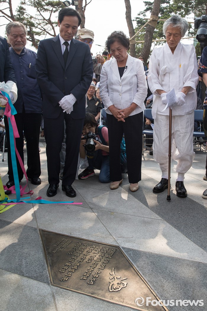 (서울=포커스뉴스) 9일 오후 서울 서대문구 연세대학교 정문 앞에서 '제29주기 이한열 열사 동판 제막식'이 열리고 있다. 왼쪽부터 이한열 열사가 쓰러지는 사진을 찍었던 전 로이터 통신 사진기자 정태원, 87년 당시 연세대학교 총학생회장을 지낸 더불어민주당 우상호 의원, 고 이한열 열사의 어머니 배은심 여사.