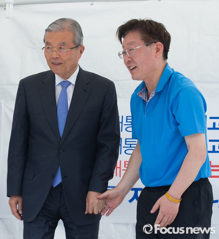 (서울=포커스뉴스) 김종인(왼쪽) 더불어민주당 비상대책위원회 대표가 8일 오후 서울 광화문광장에서 지방재정제도 개편을 반대하며 무기한 단식농성 중인 이재명 성남시장을 만나 손을 잡고 있다.