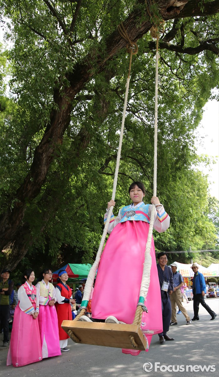 (대전=포커스뉴스) 9일 오후 (음력5월5일) 단오를 맞아 대전 동구 쌍청당공원에서 열린 판암골 단오한마당에서 한복입은 여학생이 그네뛰기를 하고 있다