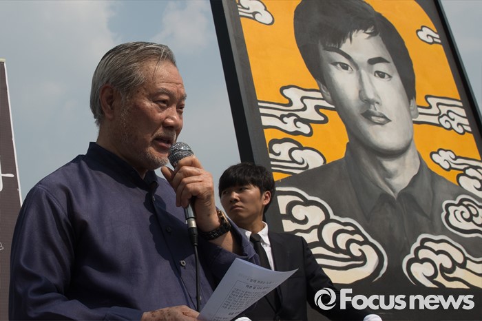 (서울=포커스뉴스) 9일 오후 서울 서대문구 연세대학교 정문 앞에서 열린 '제29주기 이한열 열사 동판 제막식에 참석한 고인의 쓰러지는 모습을 카메라에 담았던 전 로이터 통신 정태원 사진기자가 인사말을 하고 있다.