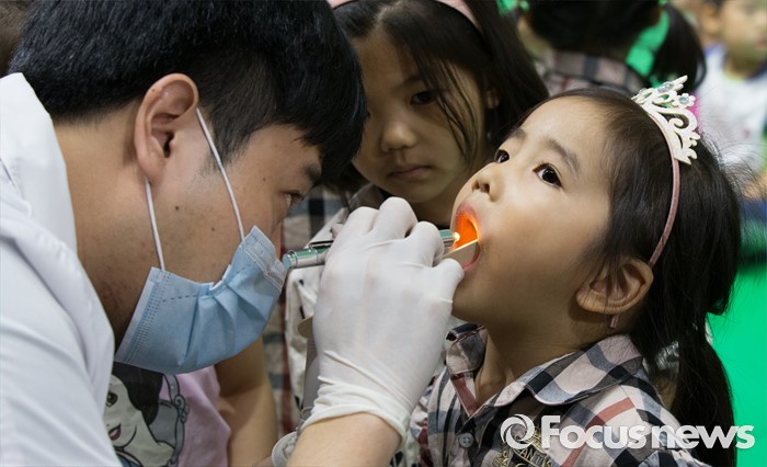 (대전=포커스뉴스) 9일 오전 구강보건의 날을 맞아 대전치과의사회 소속 치과의사들이 대전 서구 대전과학기술대학교에서 어린이집과 유치원 아동 5000여 명을 대상으로 무료 구강검진을 하고 있다.
