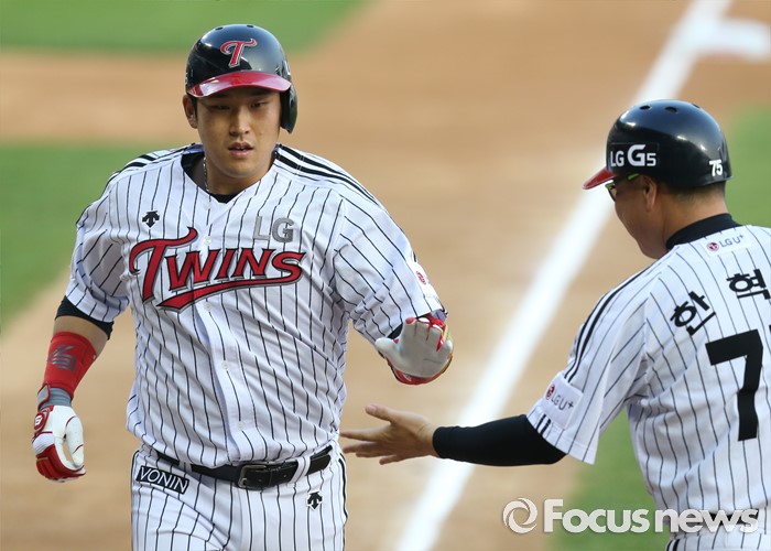 (서울=포커스뉴스) 9일 서울 잠실구장에서 열린 2016 프로야구 삼성-LG 경기 2회말 2사후 LG 유강남이 선제 좌월 솔로 홈런을 치고 한혁수 코치의 환영을 받으며 홈인하고 있다.