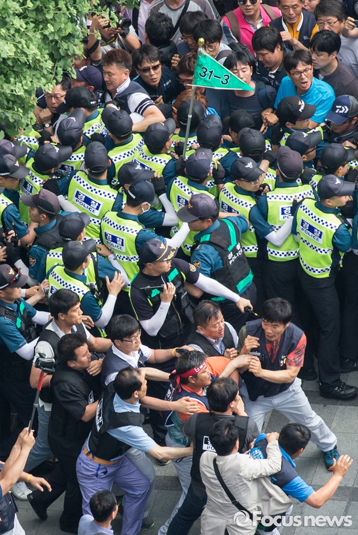 협서울=포커스뉴스) 8일 오후 서울 을지로 옛 국가인권위원회 옥상 광고탑에서 기아자동차 비정규직 노동자의 정규직화를 요구하며 363일 동안 고공농성을 벌인 한규협씨가 경찰에 의해 구급차로 끌려가고 있다.