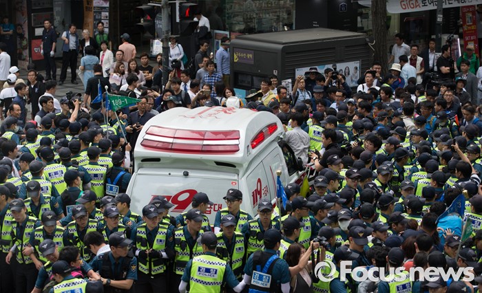 (서울=포커스뉴스) 사내하청 전원 정규직화를 요구하며 고공농성을 벌여온 기아자동차 사내하청 노동자 최정명씨와 한규협씨가 농성을 해제한 8일 오후 서울 중구 옛 국가인권위원회 건물 옥상 광고탑 농성장에서 내려와 병원으로 이동하던 중 경찰과 노조원들이 실랑이를 벌이고 있다.