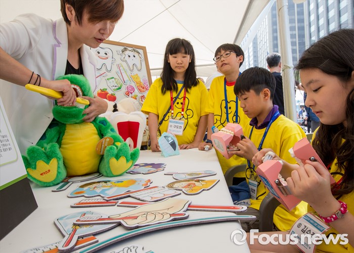 (서울=포커스뉴스) 9일 오전 서울 청계광장에서 열린 제1회 서울시민 구강보건의 날 기념행사에 참석한 어린이들이 바른 칫솔질을 배우고 있다.