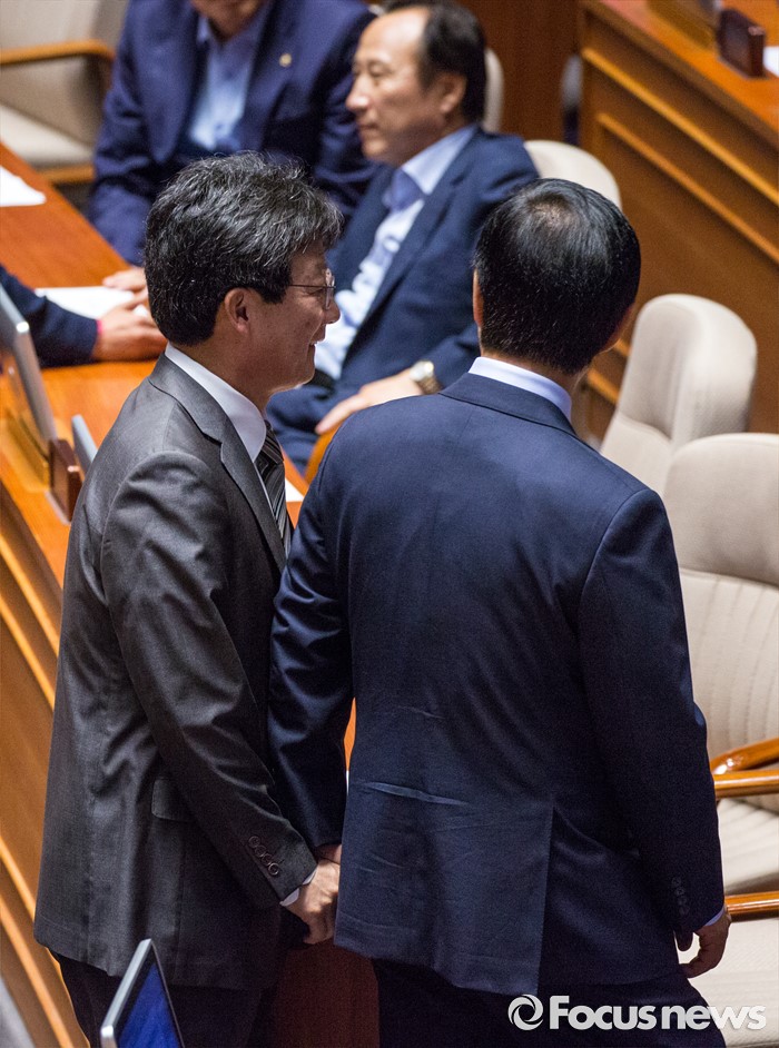 (서울=포커스뉴스) 김성태 새누리당 의원과 유승민 무소속 의원이 9일 오후 서울 여의도 국회에서 열린 본회의에 참석해 대화를 나누고 있다.