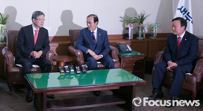 (서울=포커스뉴스) 김희옥(왼쪽) 새누리당 혁신비대위원장이 10일 오후 서울 여의도 당사를 방문한 이원종(가운데) 대통령비서실장, 김재원 청와대 정무수석과 면담을 하고 있다.