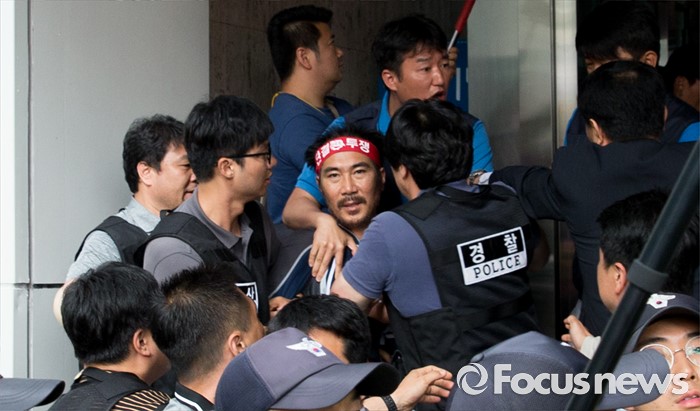 (서울=포커스뉴스) 사내하청 전원 정규직화를 요구하며 고공농성을 벌여온 기아자동차 사내하청 노동자 최정명씨와 한규협씨가 농성을 해제한 8일 오후 서울 중구 옛 국가인권위원회 건물 옥상 광고탑 농성장에서 내려와 병원으로 이동하던 중 경찰과 노조원들이 실랑이를 벌이고 있다.