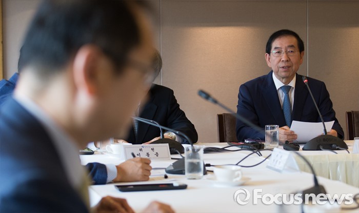 (서울=포커스뉴스) 박원순(오른쪽) 서울시장이 8일 오후 서울 중구 프레스센터에서 열린 2016 제1회 서울시 노사민정협의회 본회의에 참석해 인사말을 하고 있다. 서울시 노사민정협의회 구성 후 협의회구성원 모두가 한자리에 모이는 것은 15년 만이다.