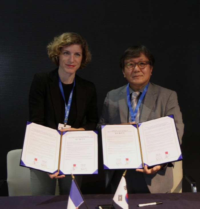 송성각 한국콘텐츠진흥원 원장은 "이번 MOU 체결을 계기로 한국과 프랑스 양국 문화스타트업의 활발한 협업을 기대한다"고 말했다.송성각 한국콘텐츠진흥원 원장(오른쪽)과 카린느 비다뜨 파리앤코프레이션 대표가 문화창조벤처단지와 문화스타트업 지원기관 레 까르고(Le Cargo) 교류확대를 위한 업무협약을 맺고 기념촬영하고 있다. <사진출처=문화창조벤처단지>