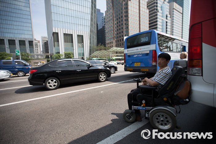 (서울=포커스뉴스) 8일 오후 서울 영등포구 여의도 환승센터 앞에서 경기장애인차별철폐공동투쟁단원들이 장애인 이동권 보장을 촉구하며 경기도행 버스를 막아서고 구호를 외치고 있다.
